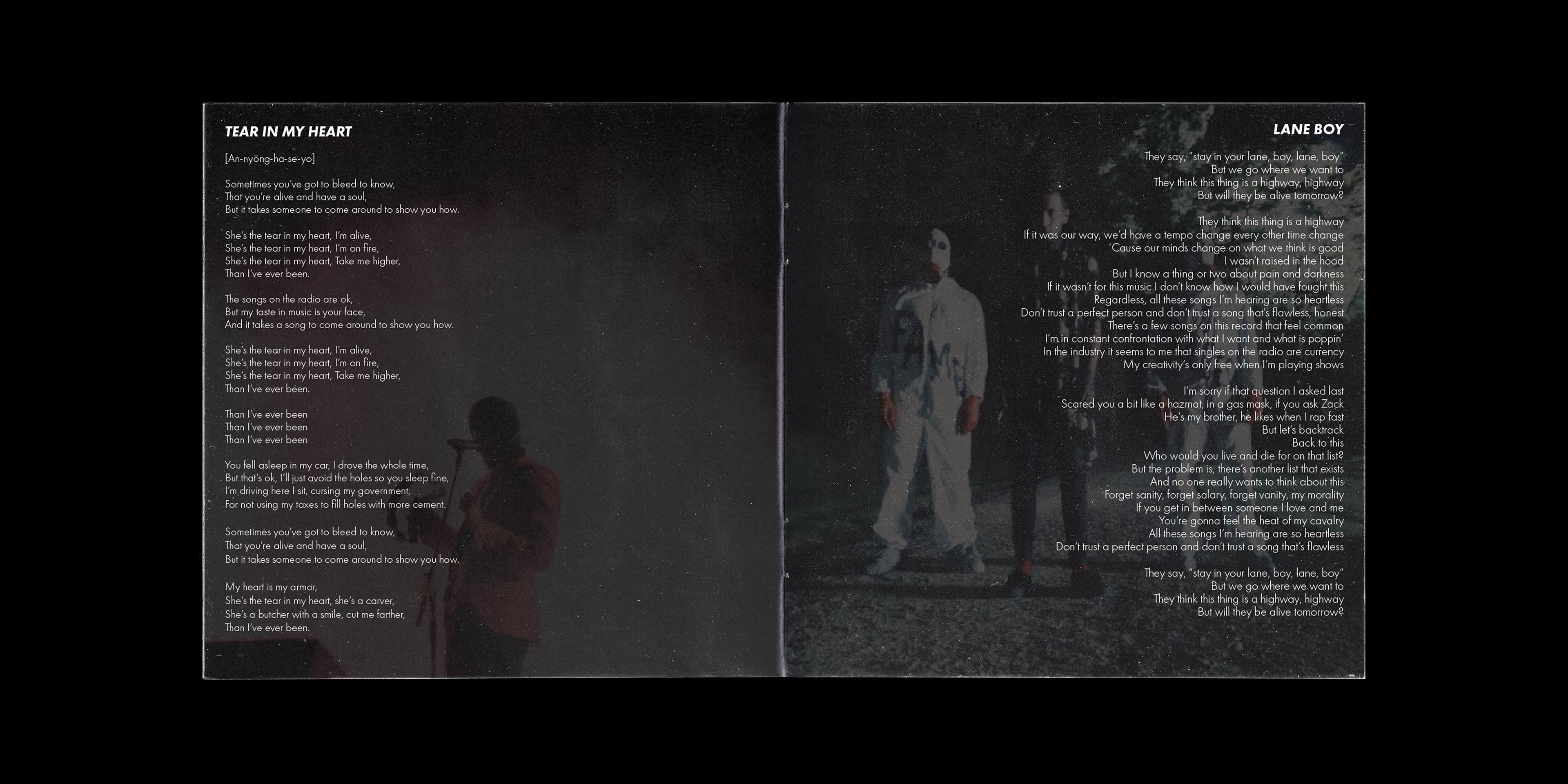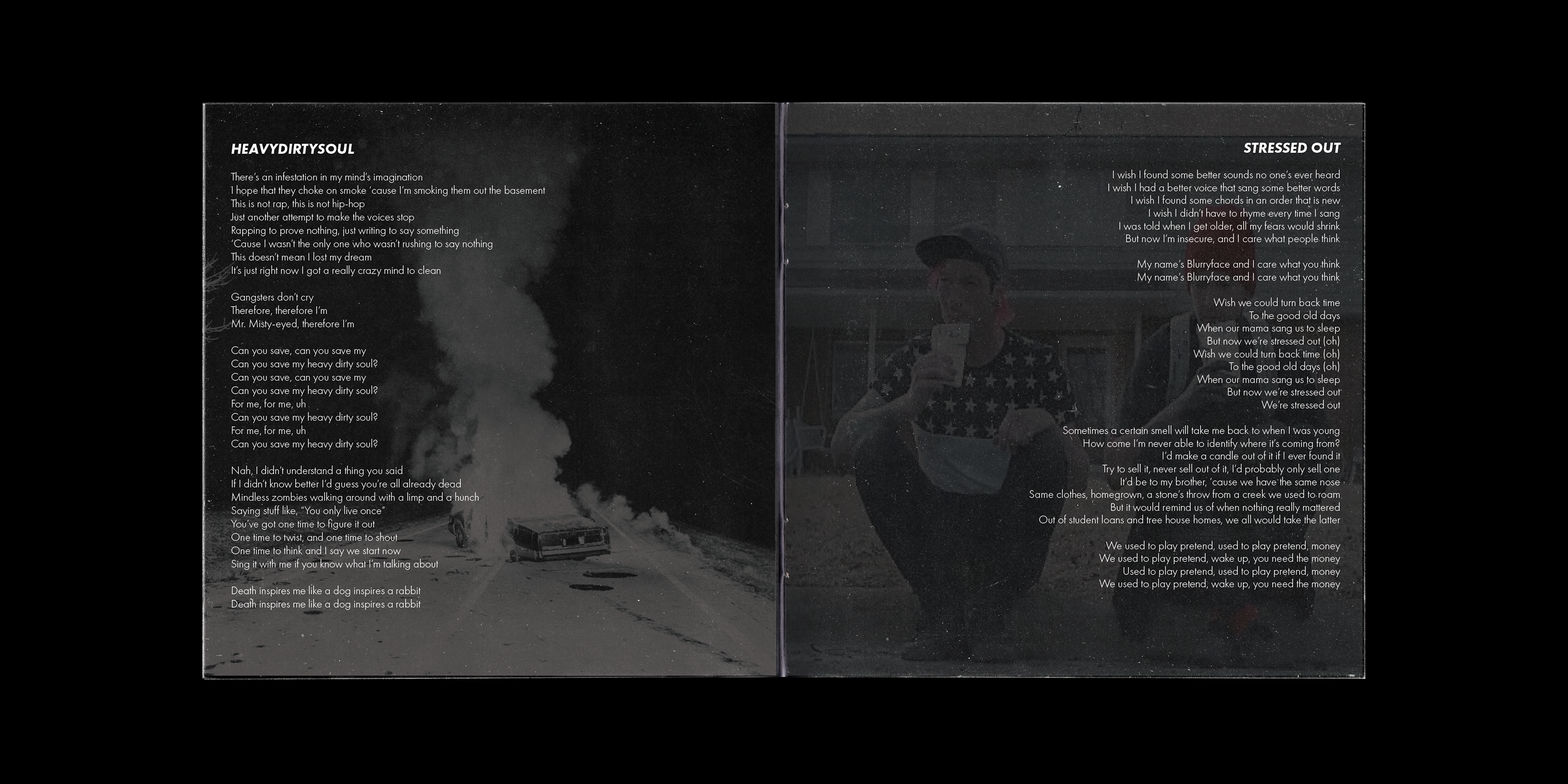 I incorporated brutalist design textures into the lyric booklet to reflect the album's grunge and basement rock aesthetic. Additionally, I included photos from the Blurryface era and integrated existing artwork from the original pressing to visually enhance each song’s theme.